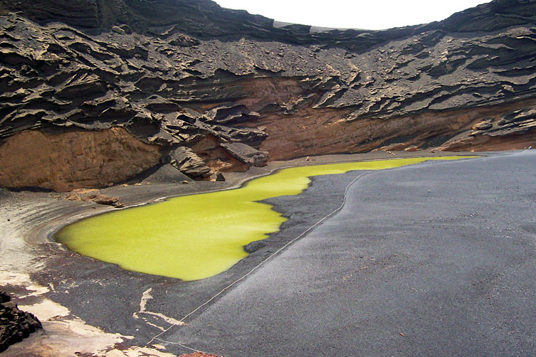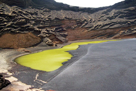 Let's discover the unique volcanic landscape of the Green lagoon Lanzarote at El Golfo. Also known as Lago verde or Charco de los Clicos, it is a world of colourful contrasts and strange shapes: a Green lake, black and red rocks and the blue sky!